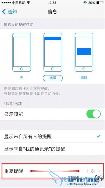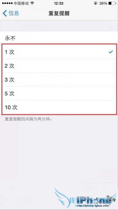 如上所示,这是一个非常简单的设置,这也体现了苹果一直强调的“人性化”设计,因为如果你愿意,你可以设置消息提醒更多次而不是两次,你可以让它重复提醒3次,5次甚至是10次。相信多数人在这里可以找到最为适合他们自己的选项。