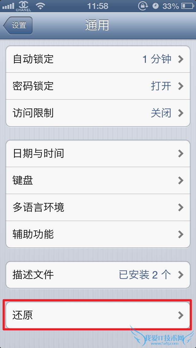 三、在通用列表的最底部找到“还原”选项,点击进入,如图所示