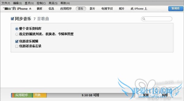 第三步,进行音频文件同步,同步时,在iPhone设备“音乐”选项页面,勾选“同步音乐”进行音乐同步。