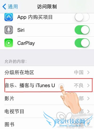 第四步,音乐同步完成后,在iPhone手机上,在设置应用中,进入“通用”,然后在“访问限制”页面,点击进入“音乐、播客与iTunes U”选项。