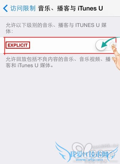 第五步,在“音乐、播客与iTunes U”选项页面,关闭“EXPLICIT”功能,即可隐藏指定的音频文件。