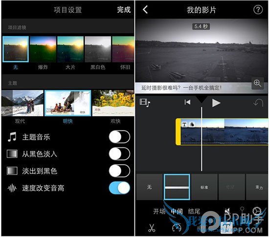 除了滤镜,你也可以在视频中添加字幕,iMovie对字幕的弹出效果进行了预设,你可以选择合适的加入。但遗憾的是手机未越狱,字体只能选择系统自带的。