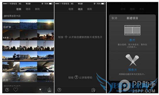 iMovie现在可以直接在Apple Store中下载,这个应用挺大,最好是连着WiFi下载。这个应用其实比较容易上手,当你进入后,手机中的视频就会被自动读取出来了。iMovie主要分为三块:视频、项目、影院。