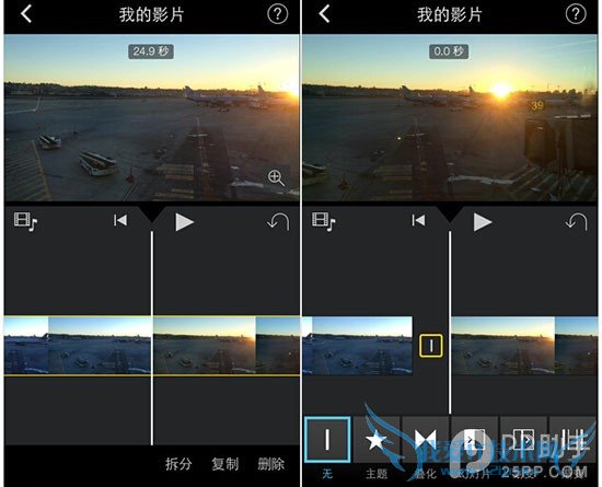 当然,一段完整的视频剪掉一部分之后难免不完整了,为了让各片段在播放时衔接完整,你需要在段与段之间添加转场效果。iMovie提供了5种转场效果:主题、叠化、幻灯片、划变、渐变。转场效果不宜频繁更换,统一选择叠化或者渐变即可。