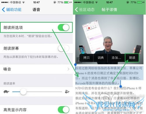 选择“降低透明度”,控制中心、通知中心和文件夹的透明背景都会变黑。选择“加深颜色”,菜单的蓝色会变成深紫色。选择“降低白点值”,整体颜色的背景都会变暗一些,不再那么刺眼。 第三个是语音朗读:上班路上好助手 打开朗读功能后,我们就可以选中一段文字,然后选择“朗读”,就可以听到Siri为我们朗读了…在地铁公车上不方便看的时候就可以使用这个功能了。当然你也可以打开“朗读屏幕”选项,这样双指下滑就可以朗读整个页面了。