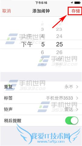 2)在【添加闹钟】页面,上方可选择【闹钟响铃时间】,下方可设置闹钟的【重复】方式、【标签】、【铃声】以及是否开启【稍后提醒】,都设置完后,点击右上角【存储】即可完成闹钟添加。(如下图)