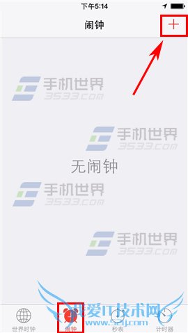 1)打开iPhone6的【时钟】,选择【闹钟】栏,点击右上角【+】。(如下图)