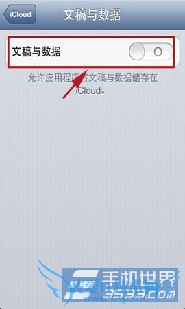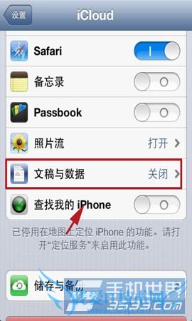 2)在iCloud列表中找到“文稿与数据”选项,点击进入,然后关闭已打开的文稿与数据开关。(如下图所示)