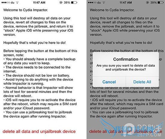 4. 阅读说明后点击“delete all data and unjailbreak device”(删除所有数据并恢复设备到未越狱状态),然后点击“删除所有”确认。