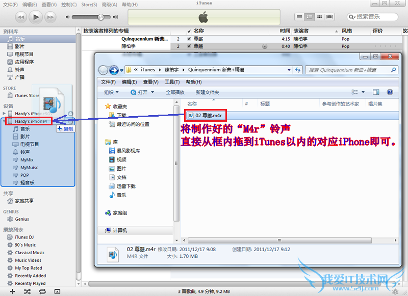 ⑧ 将修改后的M4R铃声直接拖到设备iPhone上即可。