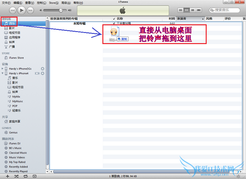 ② 点选资料库音乐 - 在桌面直接将铃声拖入音乐栏目