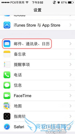 打开设置后找到如图中的“邮件、通讯录、日历”选项,点击进入。