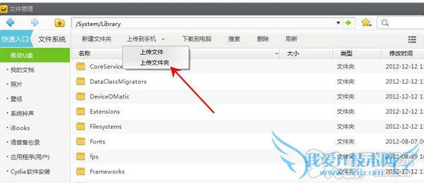 打开PC端91助手,进入文件管理目录/System/Library。依次点击按钮【上传到设备】->【上传目录】,然后将之前备份的文件夹Fonts上传到设备上去即可。