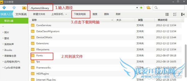 第三步.打开PC端91助手,进入文件管理目录/System/Library/Fonts/Cache。