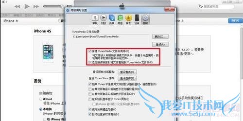 第三步:打开“偏好设置”页面后,我们要选取最右边的“高级”选项,进入后“保持iTunes Music文件夹有序”和“添加音乐到资料库时复制文件到iTunes Music”,确定。