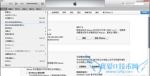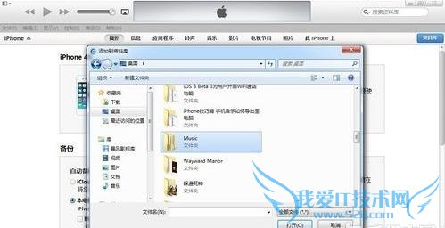 第四步:接下来我们就回到了iTunes软件界面,这时我们要点击“文件”菜单中的“将文件夹添加至资料库”,之后选取之前用iTools软件导出的Music文件夹,完成之后,iPhone中的音乐文件就完整的导出至电脑了。
