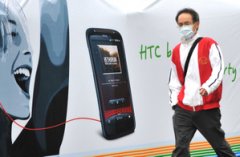 美国国际贸易委员会(ITC)19日终审裁定宏达电(HTC)侵犯苹果iPhone专利,宏达电股价19日却逆势上扬,冲到涨停板。图为一名男子行经宏达电在台北市的广告。 周一美国国...