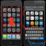 操作方法:在顶部“状态栏”和底部“dock栏”(就是屏幕下方四个图标位置)之间(如图红色方框之内),单个手指向下滑动,这样就将搜索划出来了。在iOS7下,搜索框与主屏...