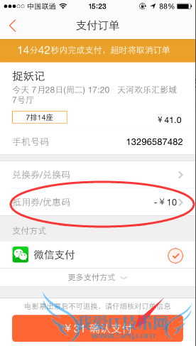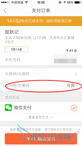 2、在选座提交订单后,大家可以看到抵用券/优惠码显示可用,点进去!