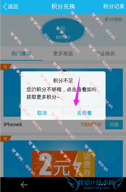 兑换的时候我们需要注意的是,积分一定要足够才可以兑换,如果积分不够的话,那么是无法兑换的,就会弹出如图所示的对话框,此时就会提示我们的积分不够。如果对积分规则不太了解的话,我们可以单击对话框上的“去看看”按钮。