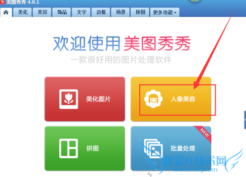 2、在我们进入美图秀秀后,我们可以到该界面分为四大板块,我们这里选定人像板块点击打开。