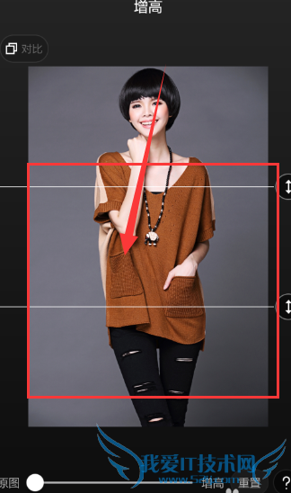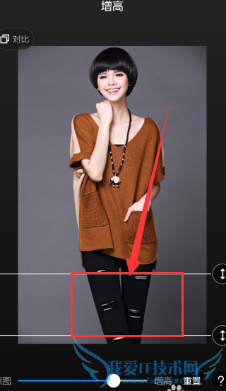 6、看到默认增高的位置不合适,接下来我们就移动增高位置,移动到腿的位置,点击下面的增高按钮之后,我们看到我们美女的腿长了。
