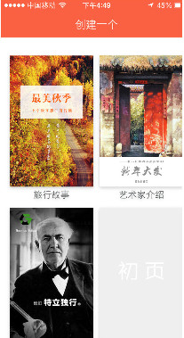 初页是将H5页面拆分成模板、图片、文字和特效四个方面,用户可以自由选择模板,将手机中的图片随意加入,并且修改文字内容,产生逻辑。