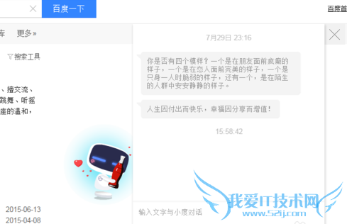 在此界面中点击“百小度”机器人,将自动在百度搜索中显示“百小度”,同时在搜索界面的右侧显示“百小度”聊天窗口,在此就可以输入内容与百小度聊天啦。