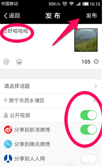 6、输入视频描述,然后选择是否分享到微博,再发布。