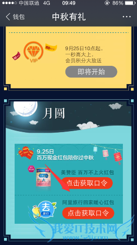 支付宝为迎接中秋节又开始派送红包啦!今日十点起,也就是9月25日十点整开始,用户输入中文口令即可有机会抢到红包!每段时间都会有,我爱IT技术网小编将提供发红包的时间和口令,大家赶紧参与吧!