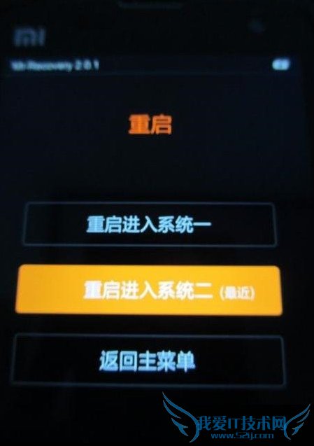 7、清除所有数据后。选择“重新开机”。这时候,你就会发现两个系统了。其中一个标注“(最近)”,这就是刚刚使用过的MIUI7了,当然,如果你选择另外一个,那么开机就会是MIUI6了。等到MIUI完善了,就可以重新升级了。