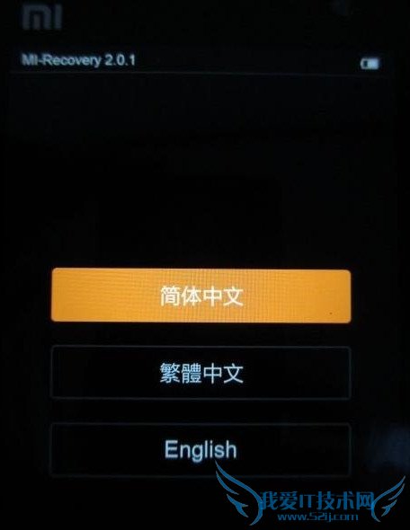 5、手机重新开机后,我们会进入Recovery界面。音量键+/-分别是控制上下,关机键用来确认。选择“简体中文”,进入主菜单。
