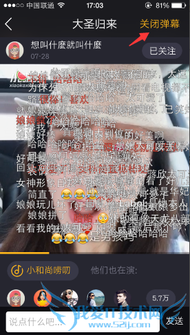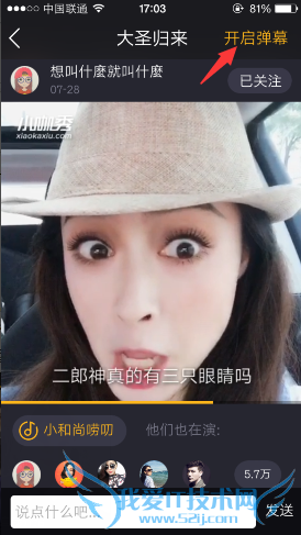 2、在进入小咖秀视频后,右上角就有开启弹幕的显示,开启后,整个屏幕都是弹幕了!你若觉得特别花,可以再次点击右侧关闭弹幕即可。
