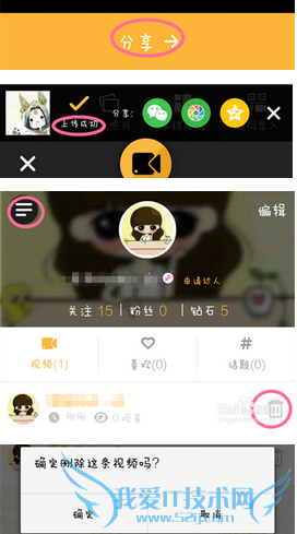 5、点击“分享”后系统会为你自动上传将视频至秒拍上,你可以继续将视频分享至其他地方,也可以点击左上方的菜单,进入你的个人首页,查看你发布的视频。点击右角上的删除可进行删除。