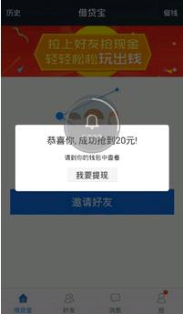 4、登录之后就会显示成功抢到20元,点击“我要提现”。