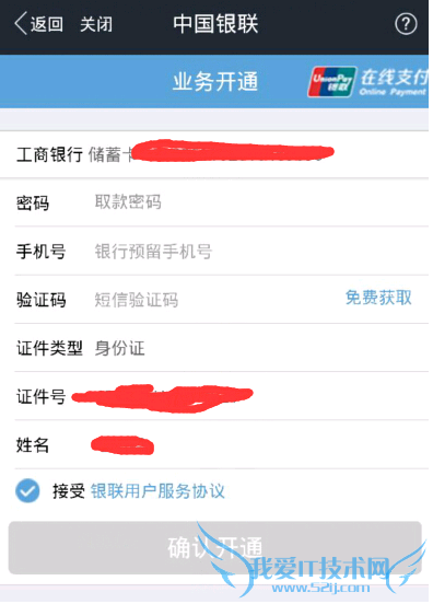 9、填好银行卡和手机号,还有验证码。确认开通。