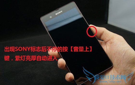 3、索尼手机关机,正常开机在出现索尼LOGO时不停的按【音量上键】,紫灯亮起后自动进入。