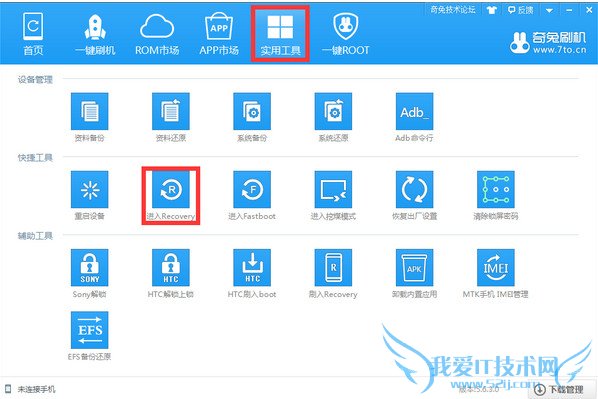 ②奇兔刷机进入Recovery模式的方法,首先下载安装奇兔刷机,然后手机打开USB调试,通过数据线连接电脑,连接成功后选择找到【实用工具】,然后选择【进入recovery】手机重启自动进入recovery模式。