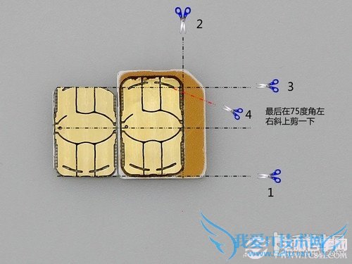 好,接下来这张图很明显了,大家根据数字顺序就可以剪卡了。第一步很容易做,直接沿着旧版的micro-SIM卡的 金属条底边将塑料边剪掉就行。第二步沿着旧版micro-SIM卡的金属条右边缘将塑料边剪掉。第三步要看仔细,看到两条拱桥行的线了吗?在线的最低点, 横向将多余部分剪掉,这里会剪掉一部分金属条,不过不要怕,对卡是没有影响的,下面会告诉你为什么。第四步,向右上边斜上剪掉边角。最后稍稍将剪好的卡背 部磨一下,不用太狠,几下就OK了。