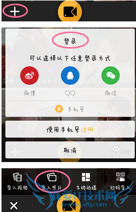 1、点击进入秒拍的首页,点击左边的“+”,此时会提醒你需要登录,可以直接授权你的qq,微博或者微信登录,选择以后会自动登录。再次进入点击添加,选择“导入照片”。