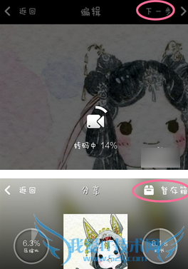 4、选择完成,点击“下一步”,再次为你转码,转码完成会进入“分享”界面,你可以点击右上方的“暂存”,也可以点击下面的“分享”。