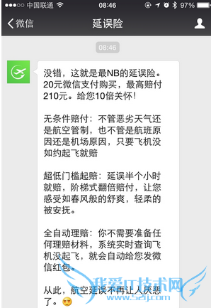微信上线了公众号“延误险”,只要20元买一份延误险,即可不用担心飞机延误,微信的延误赔款以微信红包的形式发放。