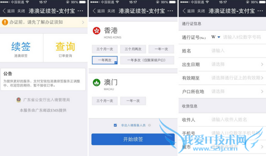 选好要续签的内容后,填写自己的通行证信息、收货地址,并且支付宝支付签注费用。