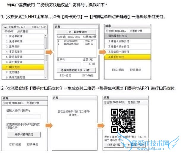 就像平常寄快递一样,打电话或者网上下单叫快递员上门收件,填好地址后,告诉快递员你要用顺手付一分钱付快递费,快递员知道后会用他的像POS机一样的扫单器生成一个二维码给你扫描支付。我碰到的这个快递员刚好知道这个活动,所以很顺利的扫码了 。但是有些快递员不知道这个活动,你可以要他打电话问问顺丰客服要怎么操作,我这边截了个图给大家参考一下。
