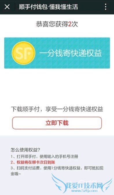 顺丰1分钱寄快递怎么用?顺丰1分钱寄快递的活动在四月份就已经推出过,如今7月份又再次推出第二期。方法还是照旧,领取权益后,下载顺手付APP绑定银行卡即可享受1分钱寄快递。不知道如何操作的用户请看我爱IT技术网小编为大家提供的史上最全的1分钱支付顺丰快递使用方法。