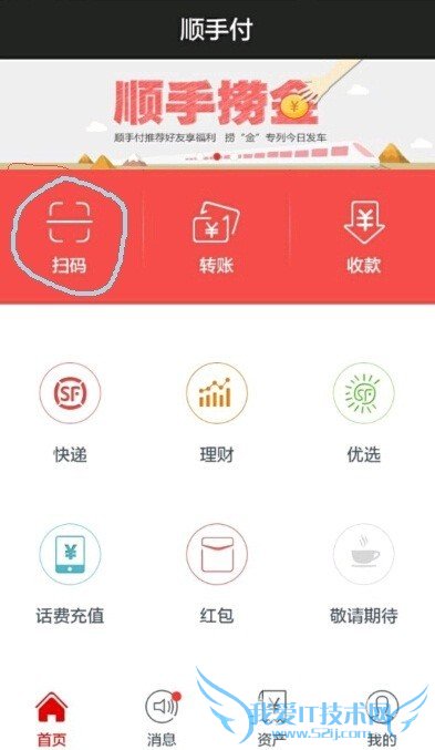你打开顺手付APP,点击”扫码“,扫快递员给你的二维码: