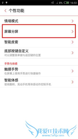 第二步:在个性功能里有个屏幕分屏选项,我们点击进入“屏幕分屏”。
