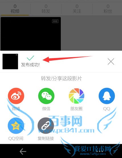 视频上传成功之后会显示发布成功,并且在下方会有一些选项供我们选择分享到哪里。假如是要分享到qq的话,那么就单击qq进行分享操作。