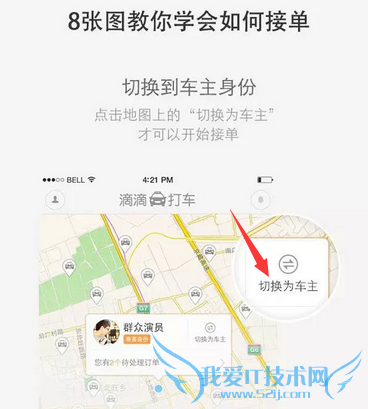 1、成功安装滴滴顺风车的用户,在打开APP后,点击地图上的切换为车主即可开始接单;