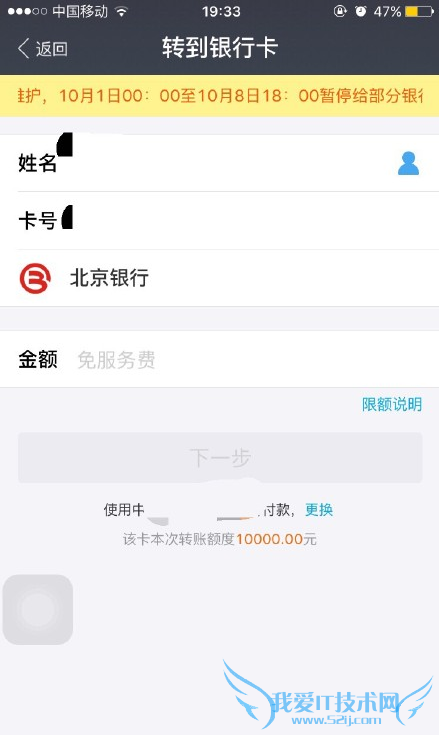 因银行维护,10月8日18:00至10月12日18:00期间暂停城商行2h转卡,次日转卡服务,给您带来的不便敬请谅解。